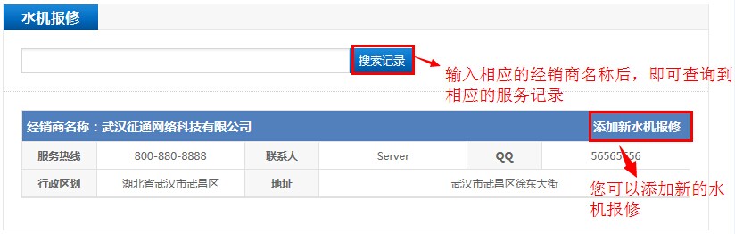 第三步:个人账户开通后,终端用户即可使用个人账户登录,并开始尝试如何通过线上报修:依次进入“线上服务”——“水机报修”,进入如下图页面,可看到商户的信息:
