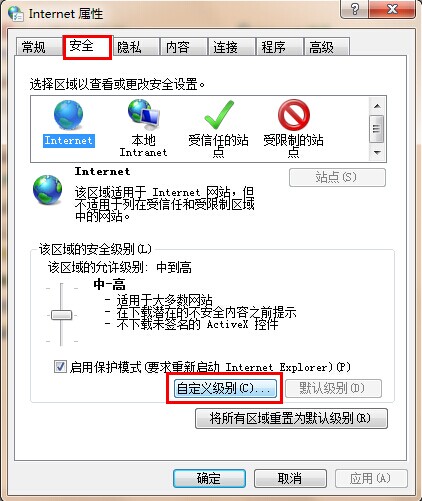 2、点击“安全”标签中的“自定义级别”,如下图: